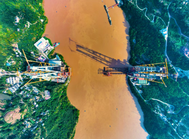 石沱长江大桥位于重庆市涪陵区,横跨长江两岸,是新渝万高铁全线控制性工程。该桥主桥全长1056米,主跨608米,是首次采用公铁合建双联塔、公铁同层分幅主梁的新时代桥梁,其5号、6号主塔高253米,是世界最高双联主塔。5号主塔已于今年6月封顶。