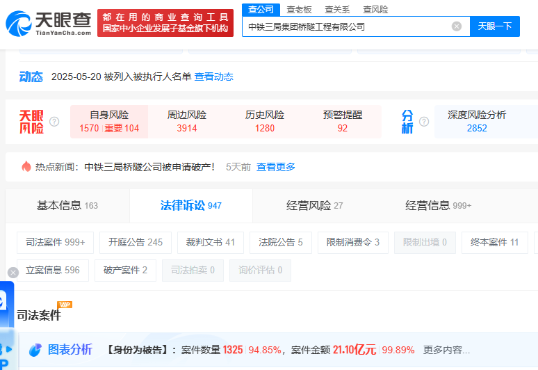桥隧公司的债务危机源于工程行业的普遍顽疾。作为央企子公司,其长期依赖“低价中标+延期付款”的模式争夺市场份额,导致利润空间被挤压。据天眼查统计数据显示,桥隧公司作为被告涉及案件金额达21.1亿元,“历史被执行人”次数高达809次,历史被执行总金额高达22.86亿元。此外,还多次被列为失信被执行人,次数高达39次,被执行总金额9242.4万元。