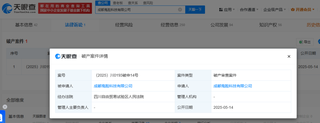 5月14日,天眼查更新了鬼脸科技一则破产信息,鬼脸科技已经像四川自由贸易试验区人民法院申请破产,案件类型为破产审查。