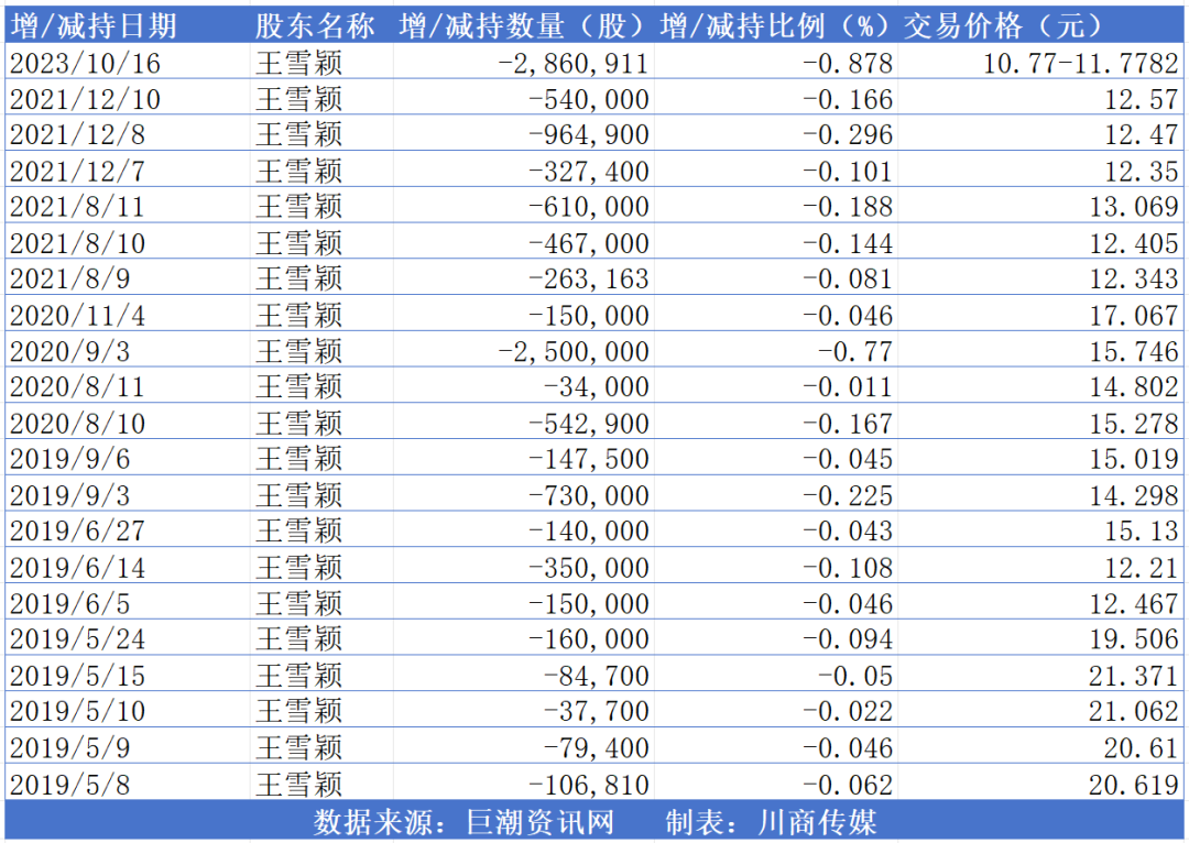 科创四川梳理发现,此次计划减持的三名高管在过去几年中已多次实施减持操作。王雪颖的减持轨迹呈现“低吸高抛”特征:2020年9月以15.75元均价减持250万股,套现3936.5万元;2023年8月在股价11.59元时减持130万股,套现1506.7万元。自2019年5月至2023年10月期间,累计减持超过1124万股,累计实施26次减持,按照每次成交均价计算,累计套现约1.46亿元;公司董事、副总经理、董秘周辉在同期通过5次减持套现557.9万元;公司董事、财务总监汪建华则通过6次减持获得324.7万元。
