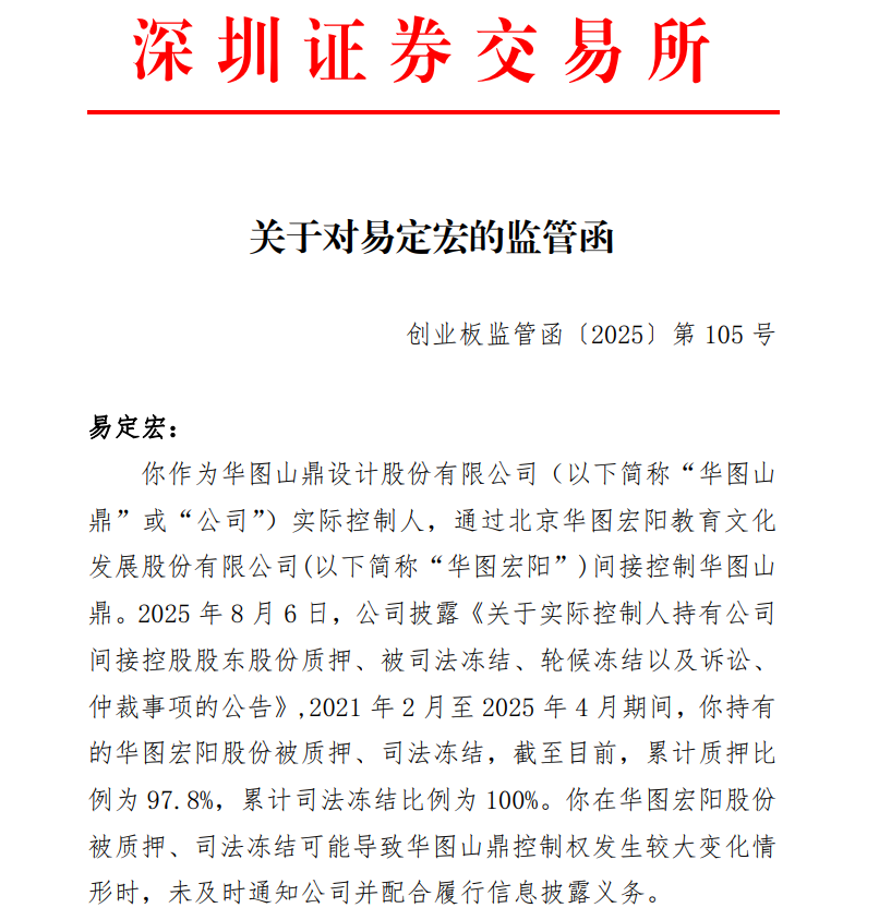 据深交所8月6日公告,华图山鼎实控人易定宏因未及时履行信披义务收到监管函。深交所监管函显示,易定宏在华图宏阳股份被质押、司法冻结可能导致华图山鼎控制权发生较大变化情形时,未及时通知公司并配合履行信息披露义务。