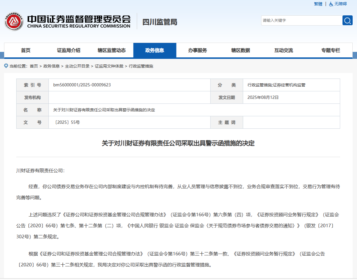 2022年以来,川财证券已连续四年被四川证监局出具警示函,其中三次直指其债券承销业务。据四川证监局8月公告,川财证券的债券交易业务暴露多项问题:内部制度与内控机制待完善、从业人员管理及信息披露不到位、业务合规审查未落实、交易行为管理需优化。