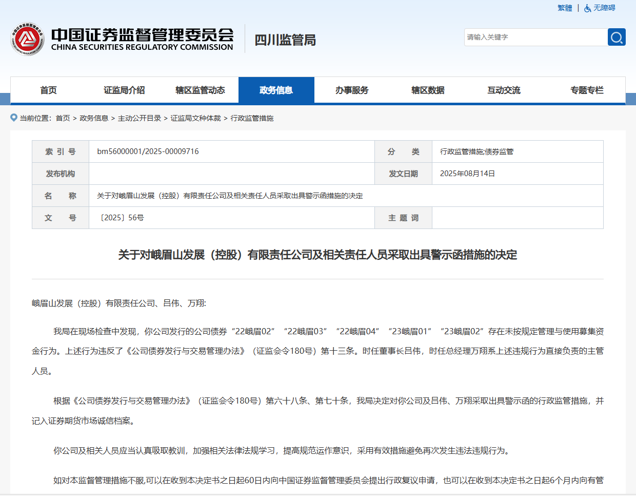 峨眉山发展(控股)有限责任公司是峨眉山新型发展投资集团有限公司旗下公司,扛着“工业强市”战略支撑的使命,并聚焦“三主一副”,以工程施工、新型建筑材料、城市运营服务为三大主业。据四川证监局8月公告,其发行的公司债券“22峨眉02”“22峨眉03”“22峨眉04”“23峨眉01”“23峨眉02”,存在未按规定管理与使用募集资金的违规行为,被四川证监局出具警示函,其直接负责的主管人员被点名。