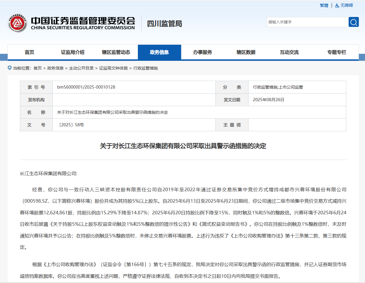 8月26日,四川证监局发布行政监管措施公告,决定对长江生态环保集团采取出具警示函的监管措施,原因在于长江生态环保集团减持成都市兴蓉环境股份有限公司(简称“兴蓉环境”)股票过程中,存在信披违规。