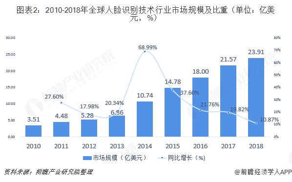 人脸识别技术在中国的发展起步于上世纪九十年代末。2018年,人脸识别技术规模为23.91亿美元。整体来看,人脸识别技术行业市场规模不断扩大,增速处于高速增长区间。相关专家预计,未来人脸识别技术将不断发展,其市场规模还会不断增长。