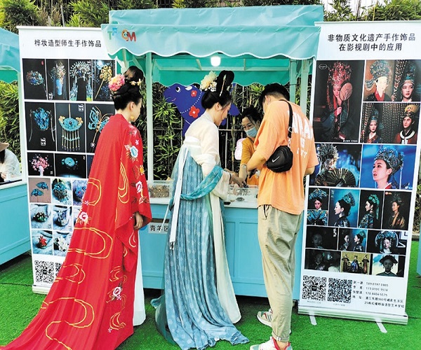 活动现场,集市主办方还专门邀请了非遗传承人、创意设计师和网红主播开展以“匠心造物”为主题的直播活动,讲述文创产品背后的天府文化内涵。主题直播在抖音、快手等直播平台为成都文创产品进行专场展示,以“文创+直播带货”搭建成都夜间消费线上新场景,受到众多网友的热情关注。