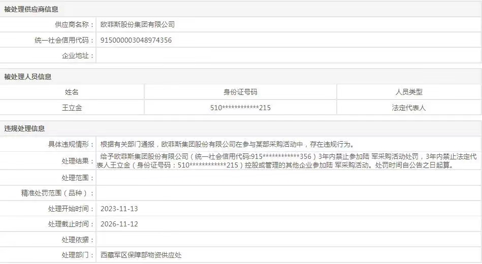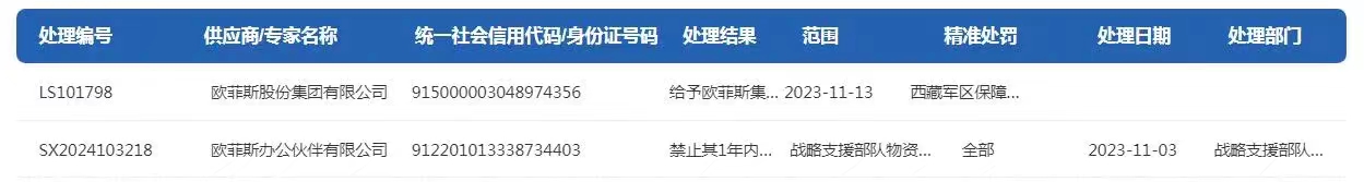 科创四川查询军队采购网发现,2023年11月13日欧菲斯股份集团有限公司因在参与某部采购活动中,存在违规行为,被禁止参加陆军采购活动3年。2024年3月8日,欧菲斯办公伙伴有限公司因采购活动中存在违规问题,被禁止1年内参加战略支援部队物资工程服务采购活动。