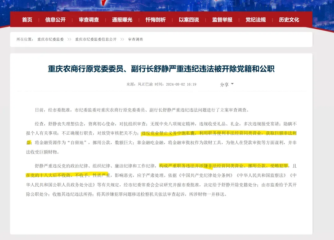 3月,渝农商行的原党委委员、副行长舒静涉嫌严重违纪违法,接受重庆市纪委监委纪律审查和监察调查。8月2日,重庆市纪委监委对这件事情的结果进行了通报:原重庆农商行副行长舒静构成严重职务违法并涉嫌非法经营同类营业、挪用公款、受贿犯罪,且在党的十八大后不收敛、不收手,性质严重,影响恶劣,应予严肃处理。