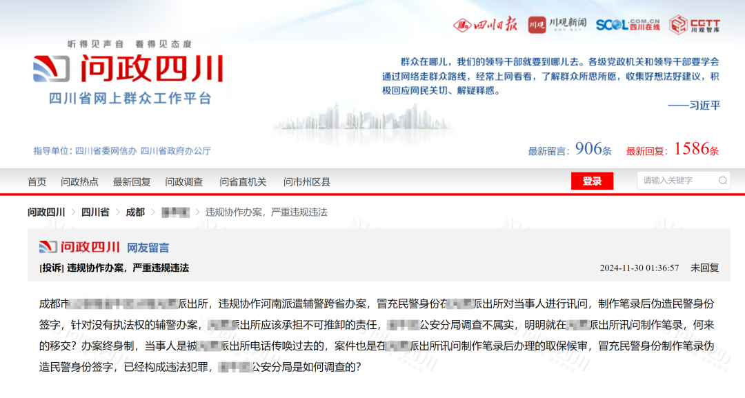就在11月30日,有网友通过四川日报问政四川平台发起投诉称,成都中心城区某分局某派出所,涉嫌违规协作河南派遣辅警跨省办案,冒充民警身份在该派出所对当事人进行讯问,制作笔录后伪造民警身份签字。目前,该投诉尚未得到回复。具体真相,尚待权威调查。