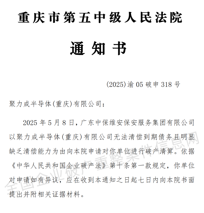 国产氮化镓(GaN)外延片与芯片供应商——聚力成半导体(重庆)有限公司(简称“重庆聚力成”)于近期收到了重庆第五中级人民法院的通知书。