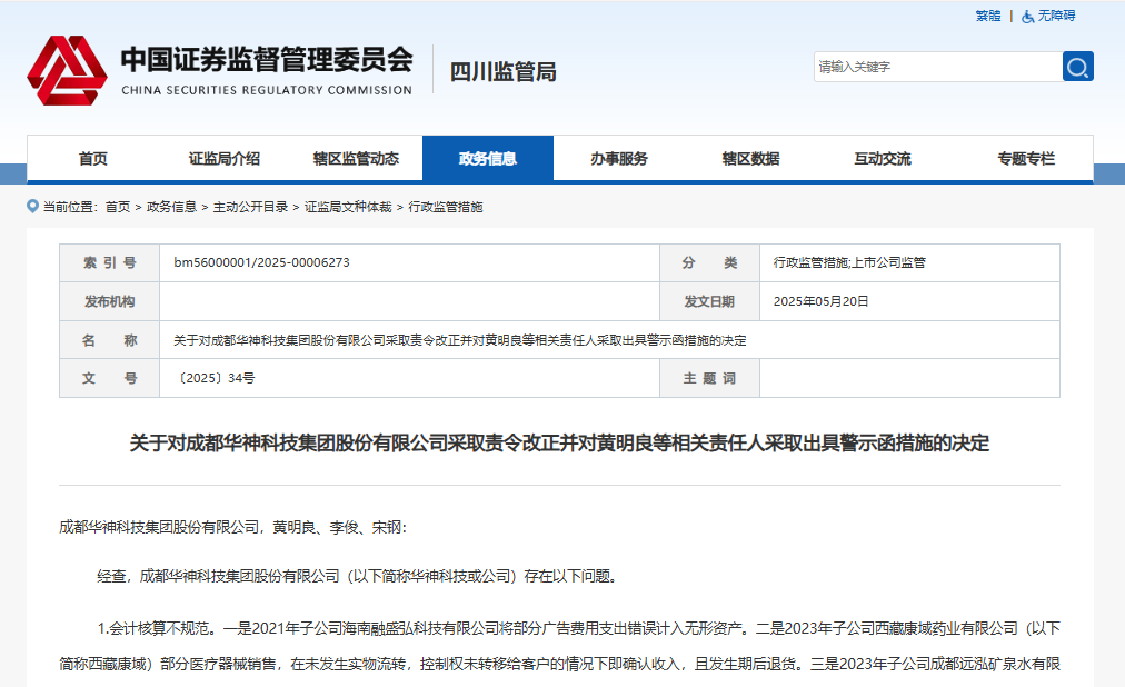 5月21日,成都华神科技集团股份有限公司(“华神科技”)发布公告称其收到四川证监局出具的行政监管措施决定书,公司被四川证监局采取责令改正并对董事长黄明良等相关责任人出具警示函。