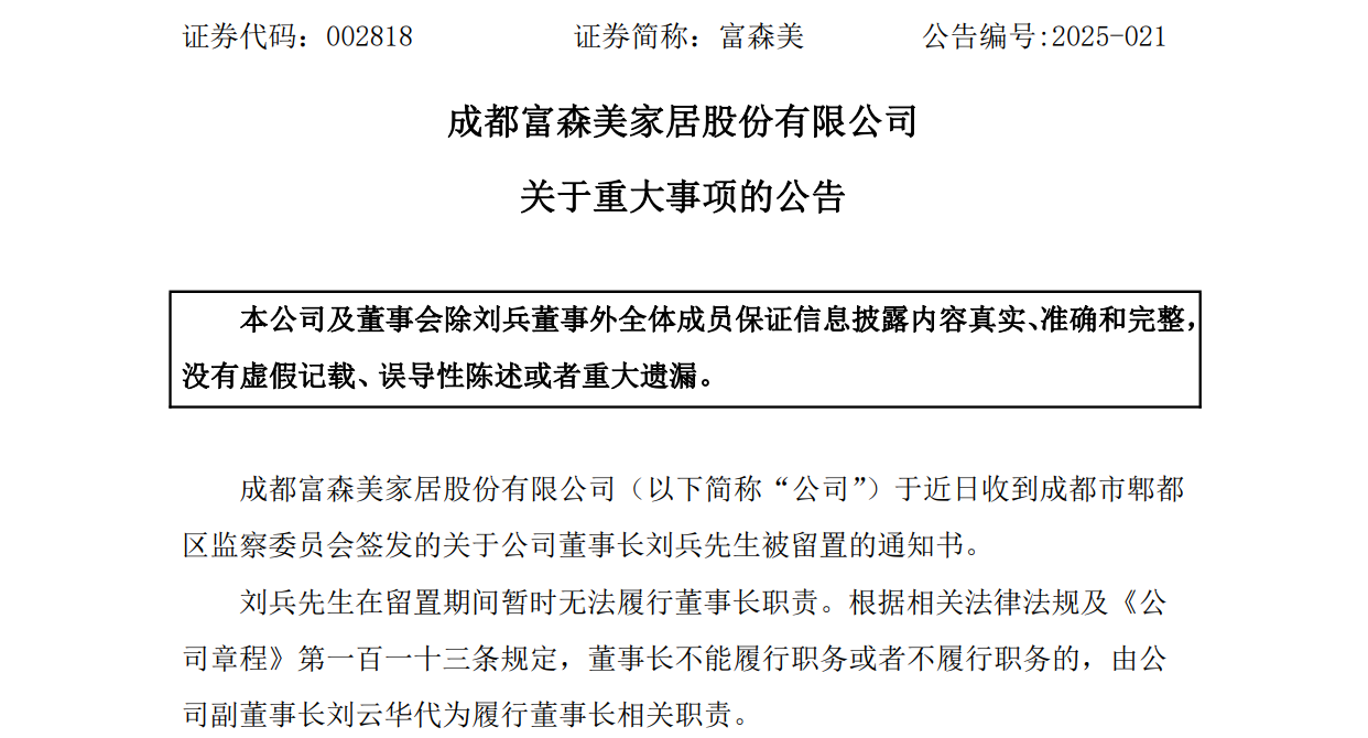 无独有偶,7月24日晚间,富森美发布公告称董事长刘兵被留置。根据公告,刘兵在留置期间暂时无法履行董事长职责,由公司副董事长刘云华代为履职。富森美强调公司控制权未发生变化,生产经营情况正常,该事项不会对公司产生重大影响。