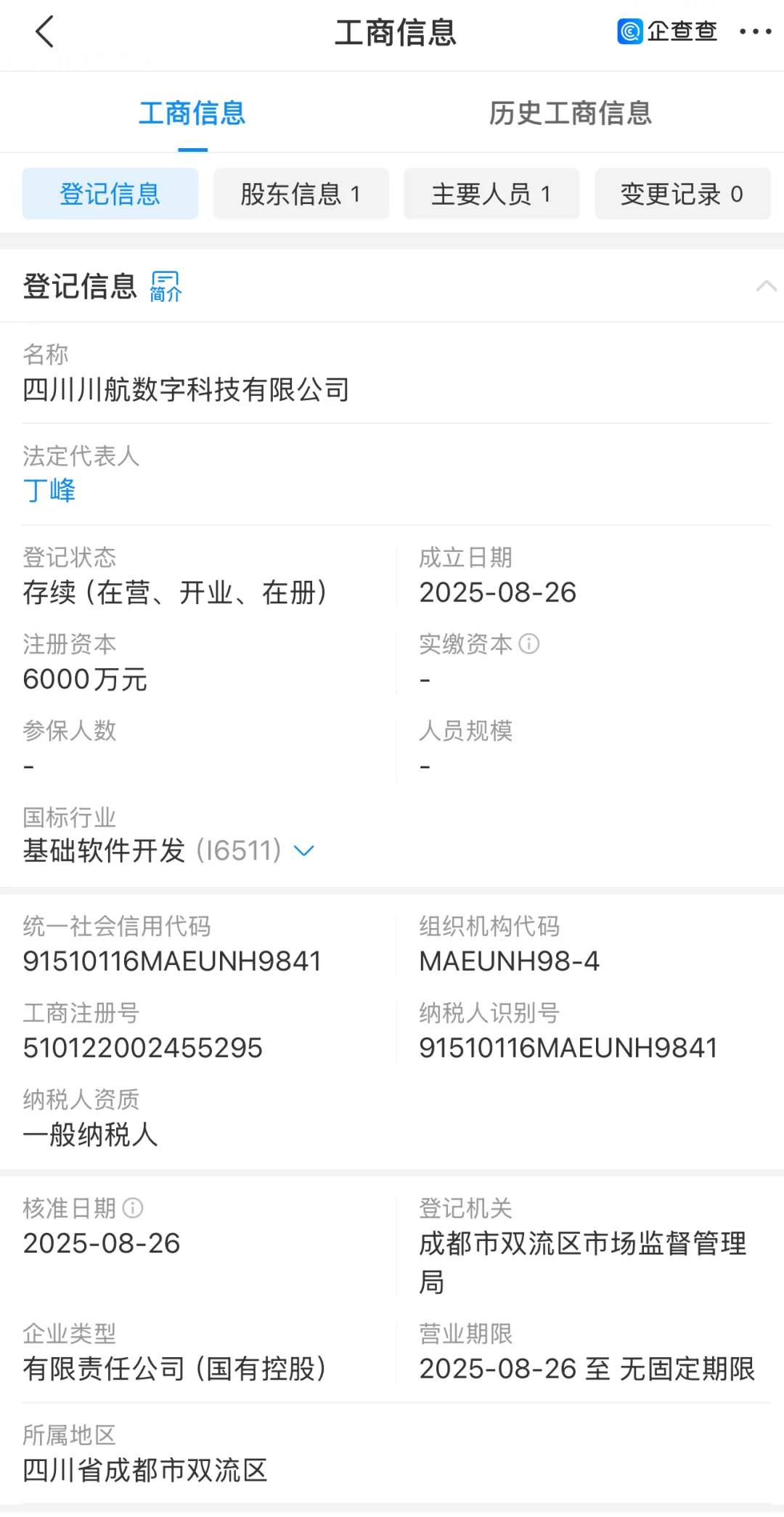 根据企查查平台信息显示,川航股份这家全资子公司于8月26日注册成立。其经营范围包括软件开发、航空商务服务、航空运营支持服务、信息系统运行维护服务、大数据服务、人工智能应用软件开发、软件外包服务、信息系统集成服务、物联网技术研发等。注册地为成都市双流区,与川航物业管理公司同址办公。