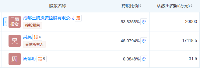 截至2025年9月18日,万腾实业股权结构方面,大股东成都三腾投资控股有限公司持股53.8358%,吴昊持股46.0794%,现法定代表人周郁珩持股0.0848%。