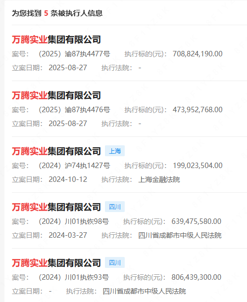 对于万腾实业而言,拍卖这部分股权,更像是“断臂求生”的无奈之举。企查查信息显示,万腾实业目前存在5条被执行人信息,被执行总金额已超过28亿元,此次股权拍卖所得款项,大概率将用于清偿公司债务。这10%天府金租股权的易主,不仅意味着万腾实业将失去一块重要的金融版图,也标志着其资产结构正在被动地大幅收缩。