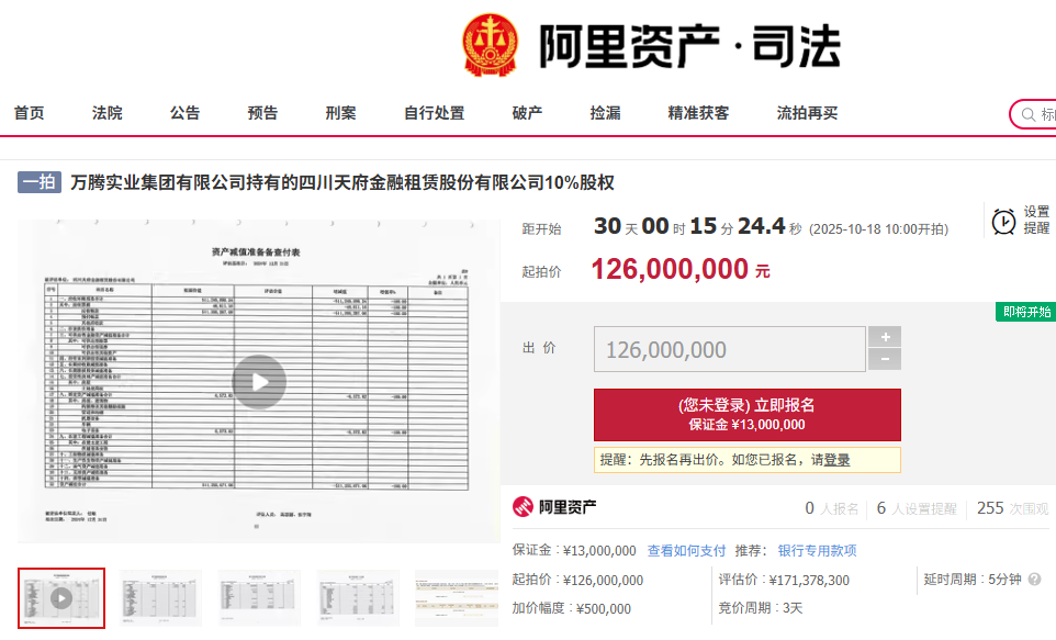金融租赁公司牌照在业内具有较高的稀缺性,其股权价值通常较为稳定。然而,万腾实业所持这部分股权却以低于评估价近三成的价格起拍,无疑反映了万腾实业当前迫切的资金需求。起拍价1.26亿元,评估价1.71亿元,这4500万元的价差,既是市场对司法拍卖资产惯有的“折扣”预期,也暗含了竞买者对万腾实业背后复杂债务链的谨慎考量。