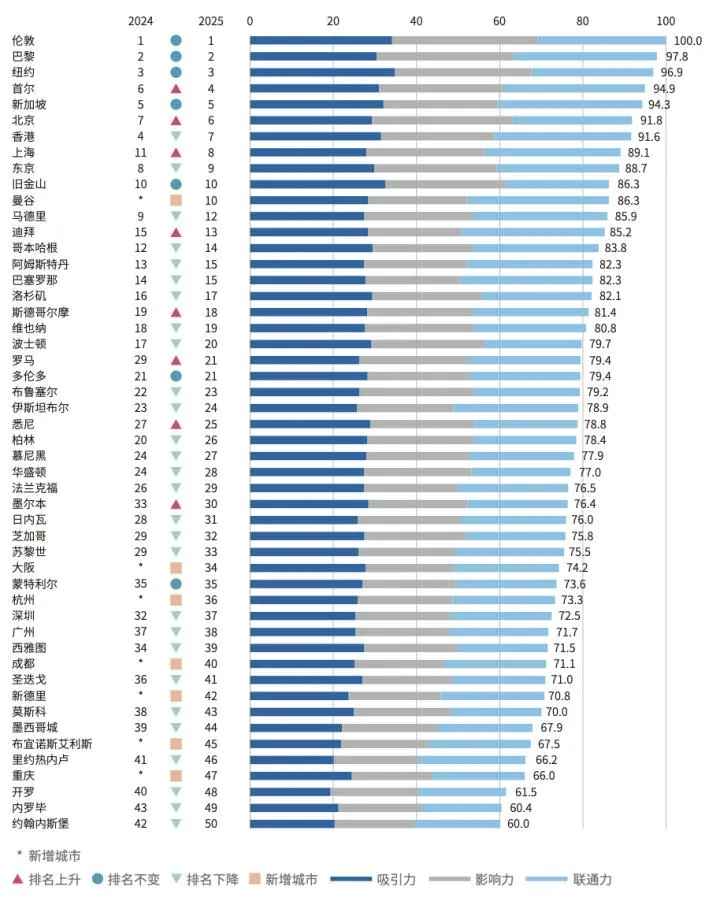 在本轮评估中,综合排名前10的城市依次为:伦敦、巴黎、纽约、首尔、新加坡、北京、香港、上海、东京、旧金山和曼谷,其中旧金山和曼谷并列第10名。