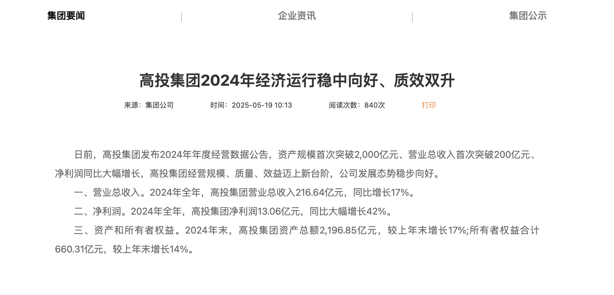 2025年5月,成都高投发布公告,资产规模首次突破2000亿元、营业总收入首次突破200亿元、净利润同比大幅增长。2024年末,高投集团资产总额2196.85亿元,较上年末增长17%;所有者权益合计660.31亿元,较上年末增长14%。