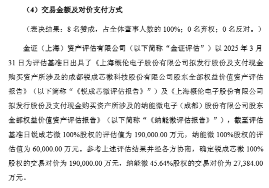 根据评估,锐成芯微100%股权评估值为19亿元,纳能微45.64%股权评估值为2.74亿元。