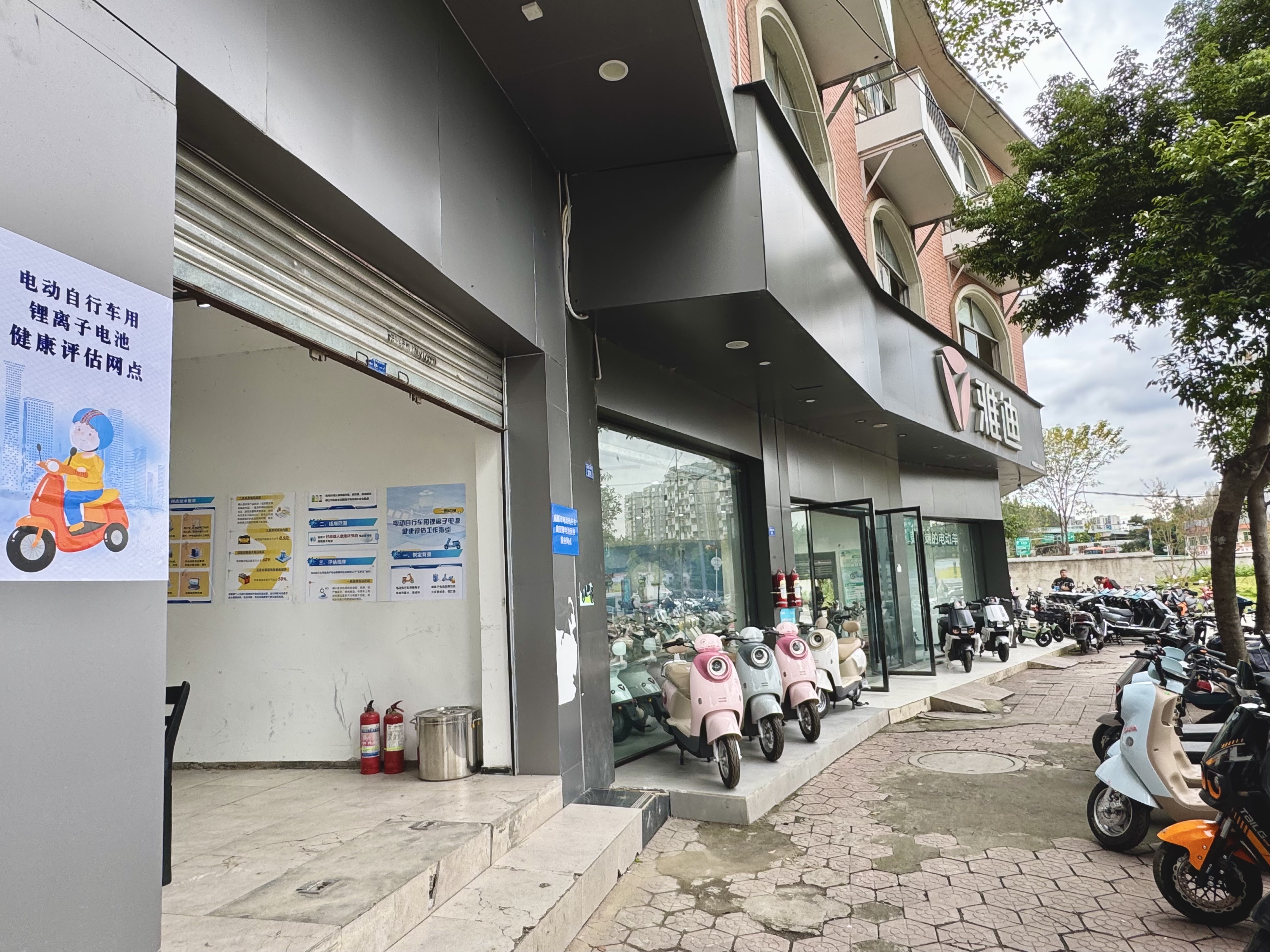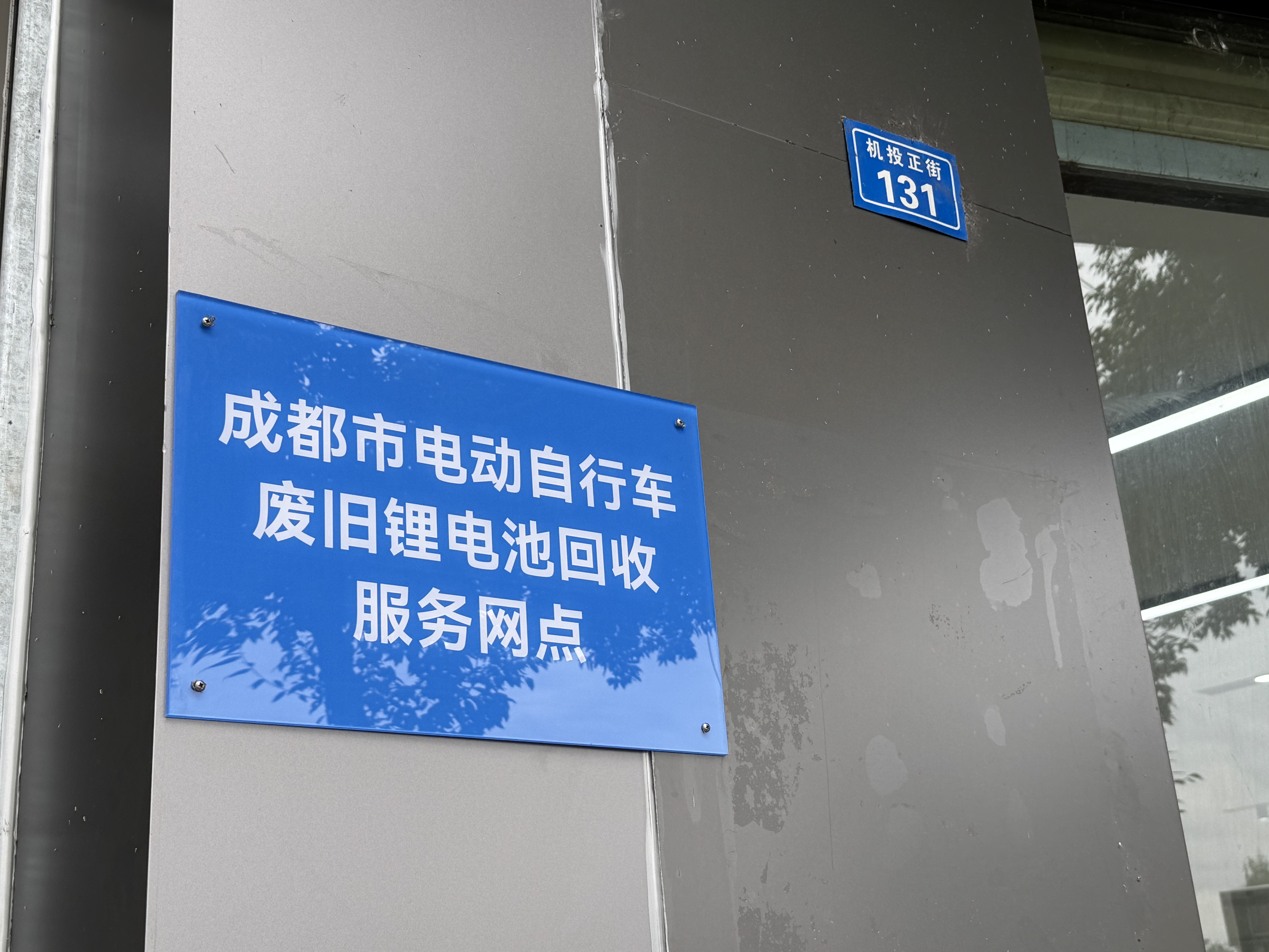 位于武侯区机投正街的回收服务网点设在电动自行车销售与维修门店内,门口悬挂着“成都市电动自行车废旧锂电池回收服务网点”的蓝色标识牌。