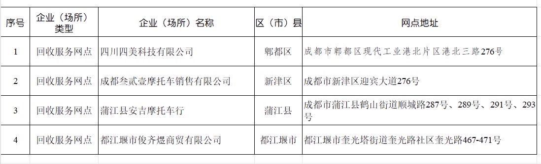 近日,成都接连公布了两批电动自行车废旧锂电池回收服务网点,网点数量已增至15个,分布于金牛区、武侯区、龙泉驿区、青白江区、新都区、彭州市、邛崃市、金堂县、大邑县、郫都区、新津区、蒲江县和都江堰市,走进了市民的“生活圈”内。