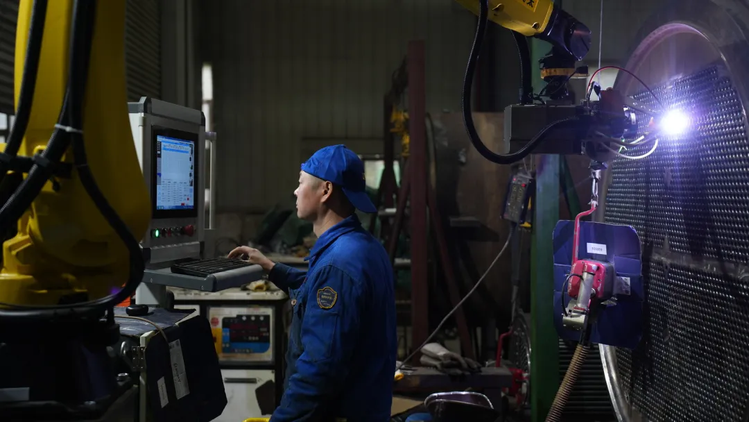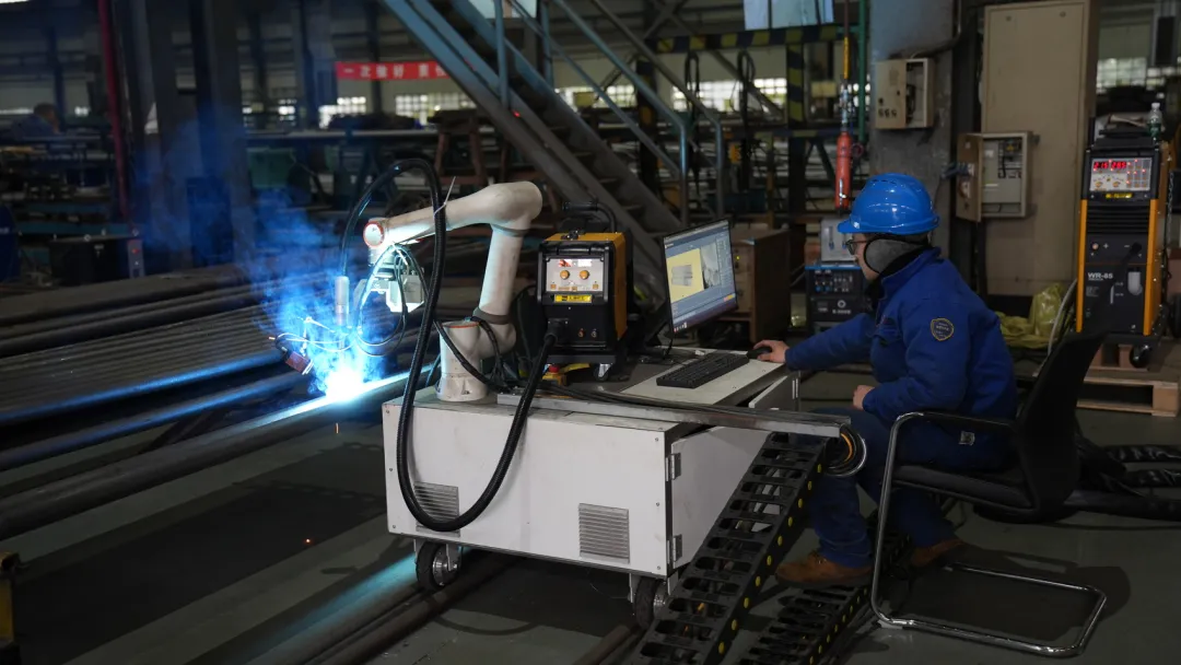 最先用上机器人的焊工孙顺隆说,以前手工焊,要提着50多斤的设备爬上爬下,焊久了手也容易发酸;现在他坐在电脑前操控机器人,“看它焊得又稳又匀,效率比我高,质量也比我好。”
