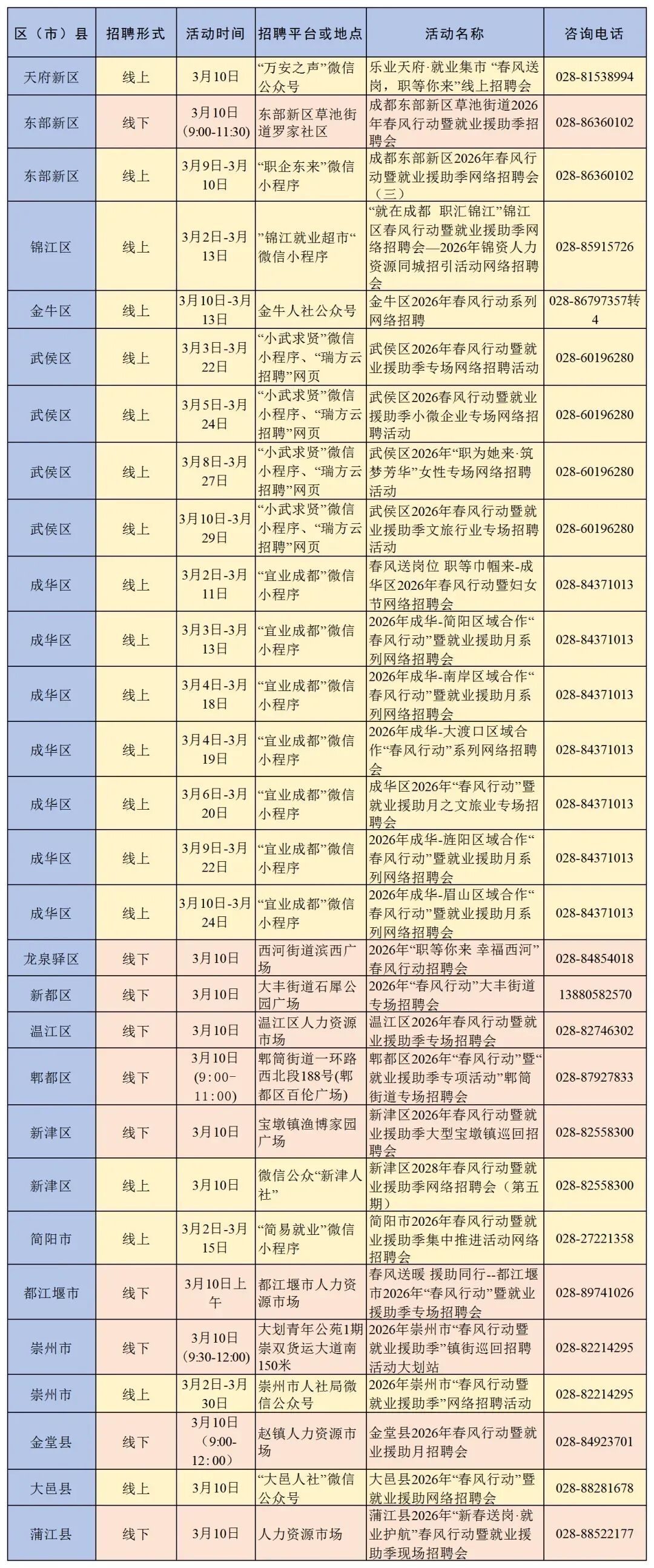 今日,成都一系列线上线下招聘活动密集开展,具体招聘信息如下表,请大家留意场次安排,提前做好准备。有需要的小伙伴请收藏。