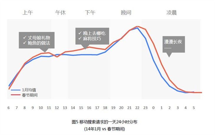 去年春节后百度推出《2014年春节移动互联网发展趋势》报告(图二),揭开春节期间的移动互联网假期特征,其中在时间分布上,移动搜索请求最高峰在晚 间22点,而一天中有三个时段春节期间移动搜索高于1月均值,分别是上午9至11点之间、下午13点至18点之间、凌晨23点至3点之间。移动搜索的时间 分布一定程度上反映了移动用户的设备使用时间分布,因此,移动广告在做时间选择上可以参考该三个时段的分布,以在准确的时间上投放移动广告。