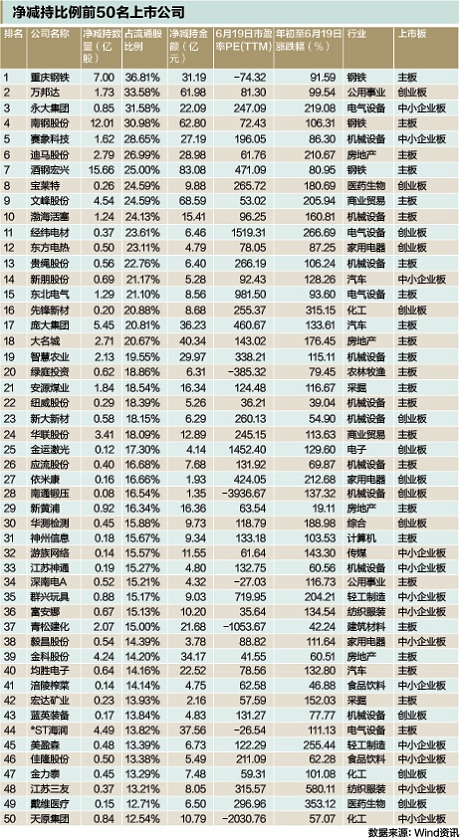 排在第三位的是永大集团,包括公司实际控制人吕永祥及其一致行动人在内的多位股东在二季度进行了减持,净减持数量达8537.31万股,占流通股本的31.58%。至于减持的目的,永大集团表示是为优化公司股东结构,增加二级市场股票的流动性。