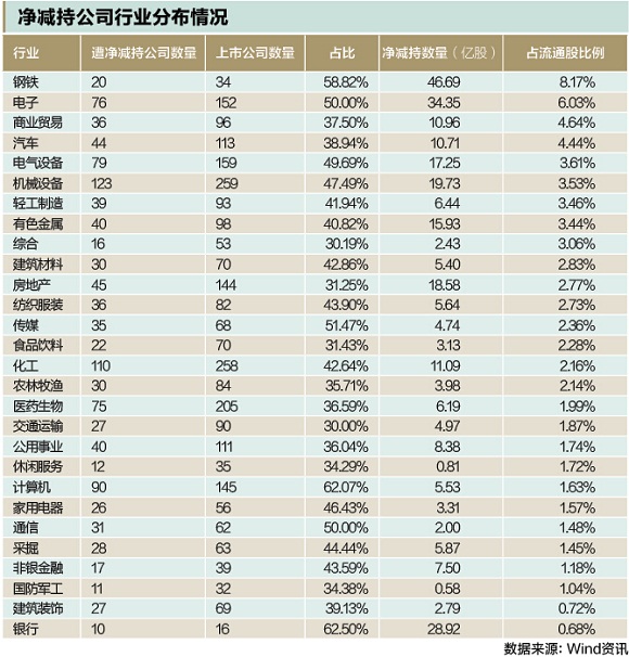 钢铁、电子板块减持严重