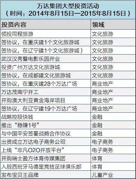 我们可以看看从2014年8月15日-2015年8月15日(胡润排行榜每年的财富统计时间),万达都有哪些大手笔的投资,如图所示: