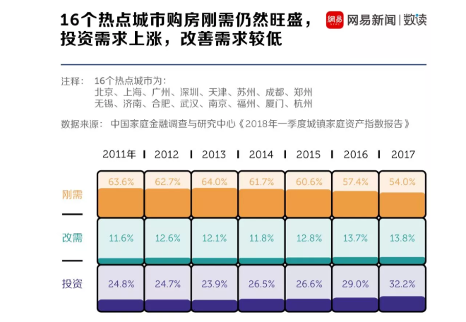 16个热点大城市的购房刚需下跌严重但仍然旺盛,人们最首要的问题依旧是“有所居”。投资需求一路上涨,2017年时已经达到了32.2%。