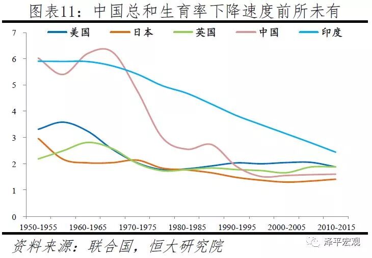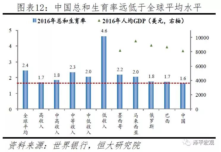 根据联合国统计,1950-2015年美国总和生育率从3.3降至1.9,日本从3降至1.4,印度从5.9降至2.4,均远小于中国的总和生育率从6到1.6的降幅。2016年中国总和生育率为1.62,在全球位居倒数,不仅远低于2.45的全球平均水平(2.45),还低于1.67的高收入经济体水平。与墨西哥、巴西、马来西亚、俄罗斯等人均GDP相近的国家相比,中国总和生育率仍然偏低。