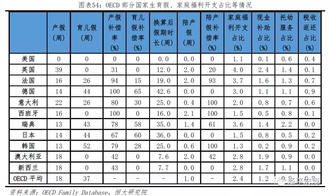 1)立法保障休假,OECD不少国家设置了3-5个月产假、6-35个月育儿假,产假平均为4.5个月,育儿假平均为9.2个月,陪产假平均为1周。
