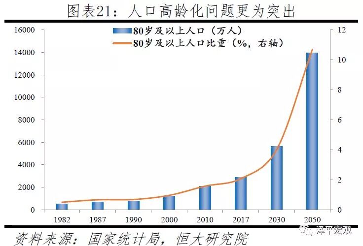 并且,高龄化使中国面临的人口老龄化问题更为严峻。2017年中国80岁及以上高龄老人约2900万人,占比2.1%。预计2030年高龄老人将达约5600万,占比4.0%;2050年高龄老人将达1.4亿,占比10.7%。