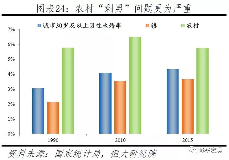 从城乡分布看,“剩男”超过一半在农村,2010年30岁及以上未婚男性在城市、建制镇、乡村的分布分别为24.4%、13.5%、64.2%,2015年变为30.0%、17.8%、52.2%。农村“剩男”问题比城市和建制镇更严重,2015年农村30岁以上男性未婚率为5.7%,超过城市的4.3%和建制镇的3.6%。