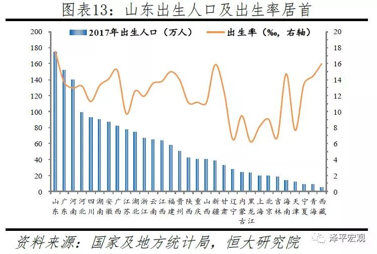 从出生人口看,2017年出生人口超过百万有山东(175万)、广东(152万)、河南(140万)等3个省,合计占全国的27%。从出生率看,山东、西藏、新疆、广西、福建等5省均超过15‰,而黑龙江、辽宁、吉林、天津、上海、内蒙古、北京等7省不到10‰,东北三省甚至不到7‰。从总和生育率看,根据2010年人口普查资料,广西、贵州均超过1.7,而北京、上海、辽宁、黑龙江、吉林则不到0.8。