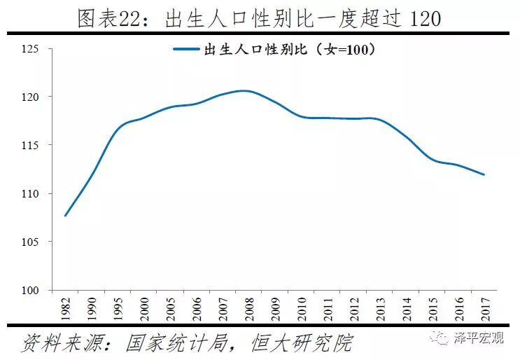 90后、00后男女性别失衡非常严重,出生人口性别比一度超过120。1982年中国出生人口性别比为107.6,1990年超过110,2000年接近118,之后长期超过120。严重失衡的出生人口性别比导致政府不得不出手干预。2011年《国家人口发展“十二五”规划》,提出2015年的出生人口性别比目标为115,这是中国首次把控制人口出生性别比纳入国家规划。2016年《国家人口规划(2016-2030年)》提出2020年出生人口性别比降至112以下,2030年降至107、即恢复到正常水平。在政策影响下,出生人口性别比从2008年的120.6开始持续下降,2017年已降至111.9。但是,即使未来出生人口性别比下降到正常范围,1980年代到2030年之间出生的人口在婚姻问题上仍将面临严重的“男多女少”性别不平衡问题。