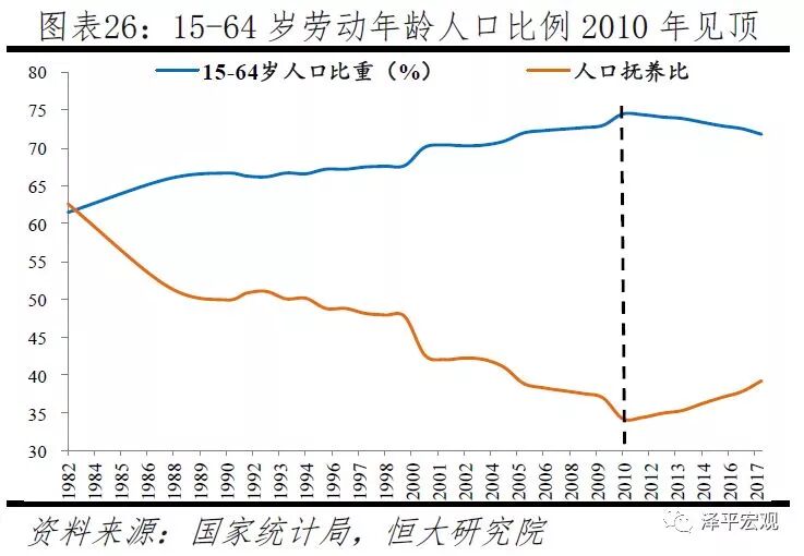 1978年改革开放后,中国依靠庞大且年轻的劳动力资源,以及与之相关的巨大市场,快速成长为世界第二大经济体。1962-1975年第二轮婴儿潮人口是改革开放40年的建设主力,生产和储蓄多,消费少,导致储蓄率和投资率上升,储蓄超过投资部分产生贸易顺差,同时过剩的流动性和人均收入水平提高推动消费升级,经济潜在增长率较高。在长期低生育率背景下,随着这些人变老,中国15-64岁人口比例和人口总抚养比均在2010年迎来拐点,储蓄率和投资率下降,消费率上升,贸易顺差收窄,经济潜在增长率下降。不过,2017年中国人口总抚养比为39.2%,未来几年仍处于人口负担较轻的“人口机会窗口”期(小于50%)。根据2010年人口普查资料,80后、90后、00后人口分别为2.19亿、1.88亿、1.47亿,90后比80后少约3100万,00后比90后少4100万。