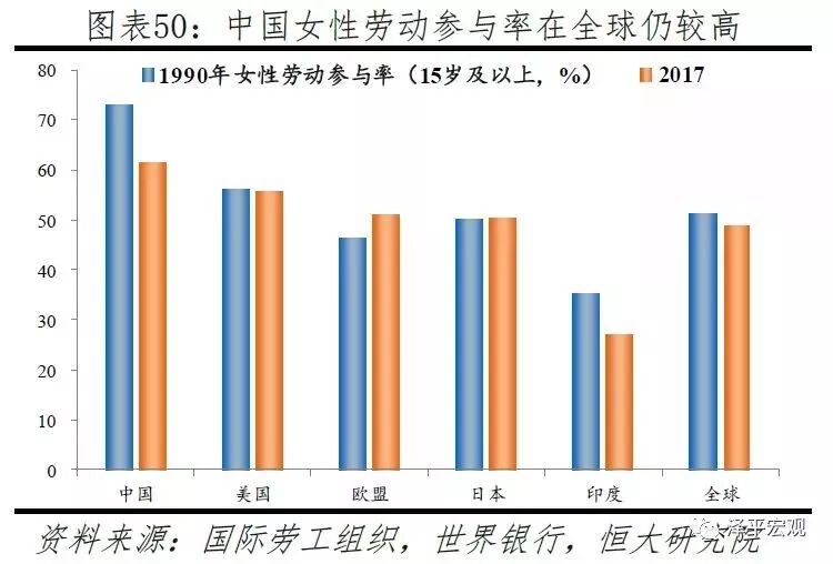 根据国际劳工组织统计,1990-2017年中国女性劳动参与率(15岁及以上)从73.2%降至61.5%,大幅下降11.7个百分点,但在全球仍然处于较高水平。2017年全球女性劳动参与率为48.7%,美国、欧盟、日本、印度分别为55.7%、51.1%、50.5%、27.2%。