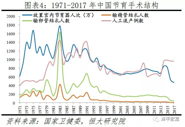 根据计划生育部门统计,1971-2017年中国不含取出宫内节育器(俗称“取环”)的节育手术总次数合计达10.1亿次;其中,放置宫内节育器(俗称“上环”)合计4.5亿人次,输精管结扎合计超过4000万人,输卵管结扎合计超过1.3亿人,人工流产合计3.9亿例。当然,其中存在部分自愿的情况,不全是计划生育事宜。1985年为中国节育手术数峰值、高达5279万次(不含取环),其中放置宫内节育器、输精管结扎、输卵管结扎、人工流产各有1776万人次、426万人、1640万人、1437万例。