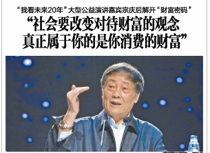 宗庆后:我们吃了很多苦,在紧缺经济的时候我们创业比较容易,现在要我重新创业难度也很大,也不一定创业能成功。现在年轻人可能没有吃过太大的苦,机会没有我们好,因为现在市场竞争已经很激烈了。你要创业首先要有目标有理想,你才有动力。第二个我认为心态要好,不能眼高手低,扎扎实实去创业。第三,过去说“三百六十行,行行出状元”,应该说每个行业都能够创业。我当时创业的时候绝对不会想到要创业成一个中国最大的饮料企业。我当时的目标就是一年挣10万块钱。那时有些小企业一年就创造1000块钱的利润,我能创造10万元的利润。